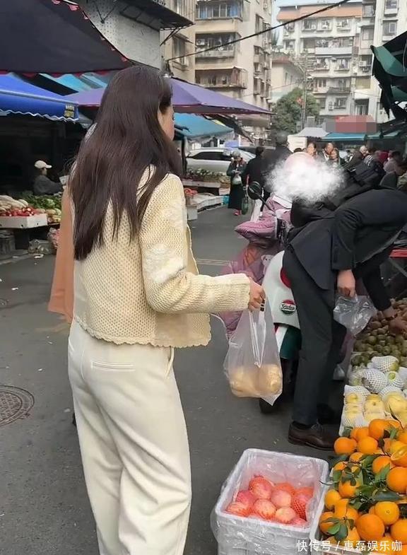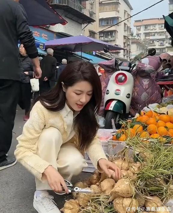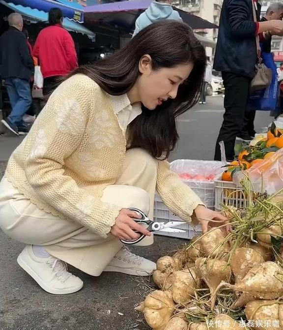 挑地瓜的时候,她还挺会干活儿,拿起小贩递过来的剪刀,咔嚓咔嚓就把地瓜上缠的藤蔓给剪掉了,挑得可仔细了。她这一身打扮跟周围买菜的大叔大妈比起来,确实有点不一样,透着股子特别的气质。真没想到大明星还自己来菜市场买地瓜,这可真是入乡随俗,一点架子都没有!